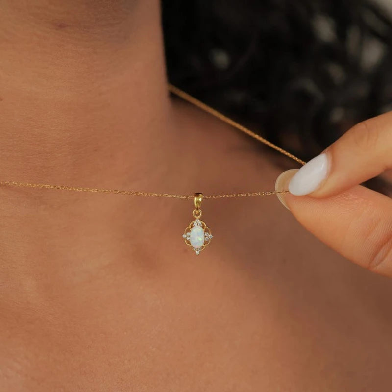 Elevate your style with our Opal Necklace, featuring a luminous opal pendant in a vintage-inspired setting. Crafted in sterling silver with a thick 18K gold plating, this timeless piece showcases the mesmerizing iridescence of genuine opal. Perfect as a meaningful gift for mom, daughter or someone special, this artisan-made opal necklace adds cosmic charm to everyday outfits. Shop opal jewelry for women and discover the glow of this elegant pendant.